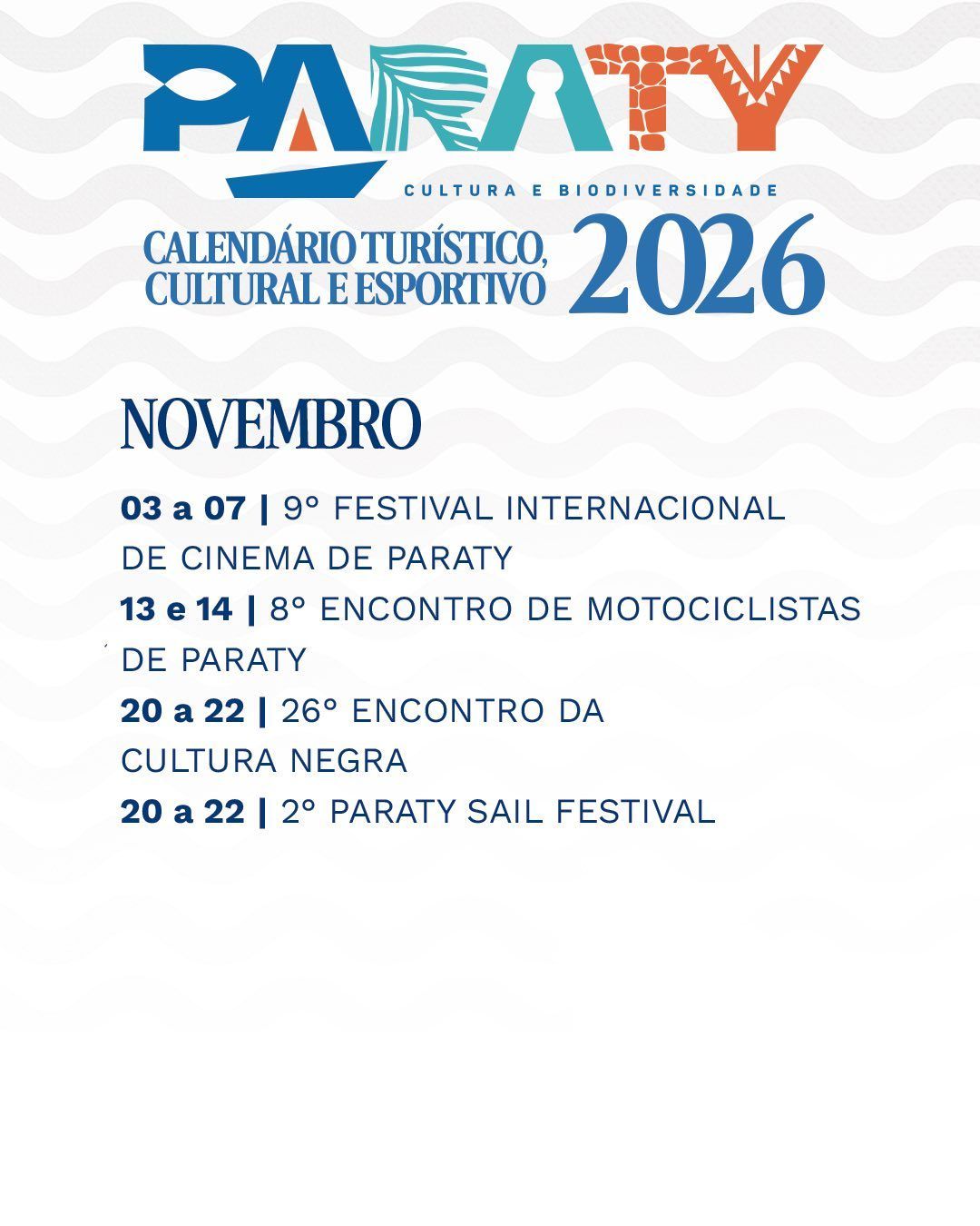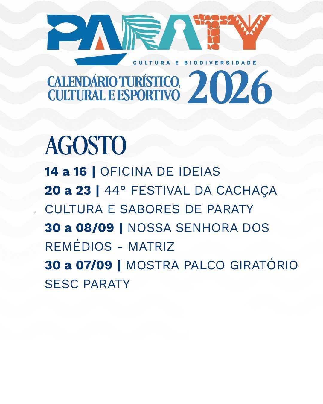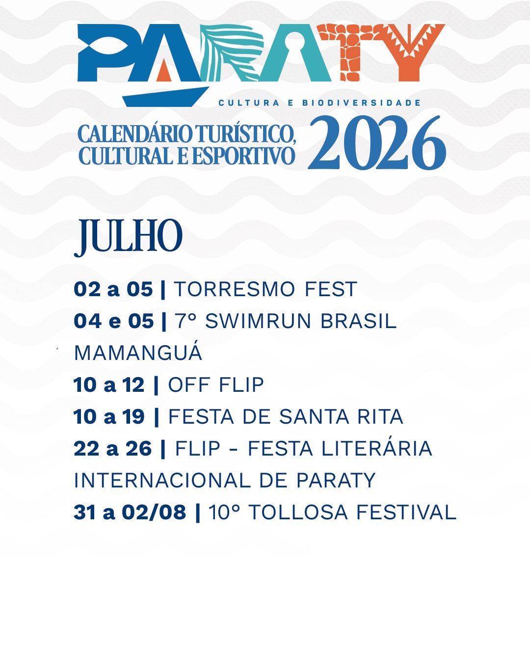 Paraty oferece um calendário turístico e cultural repleto de eventos ao longo de todo o ano de 2026, reunindo tradições populares, festivais gastronômicos, atividades esportivas, manifestações artísticas e celebrações religiosas que atraem visitantes de todas as partes do Brasil e do mundo.
