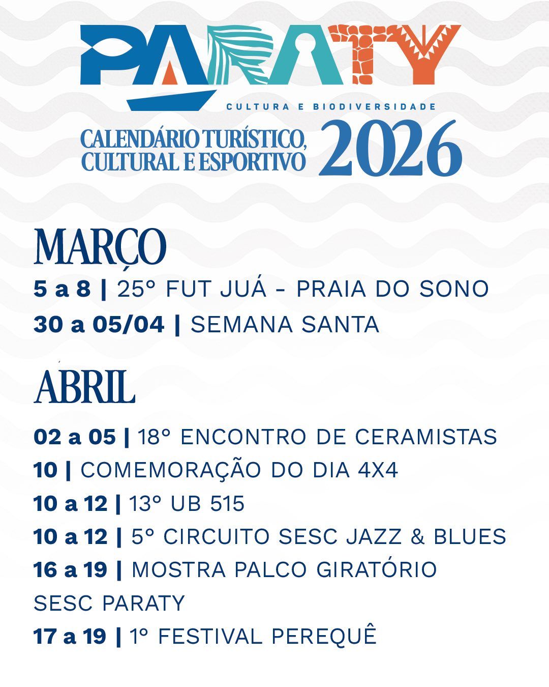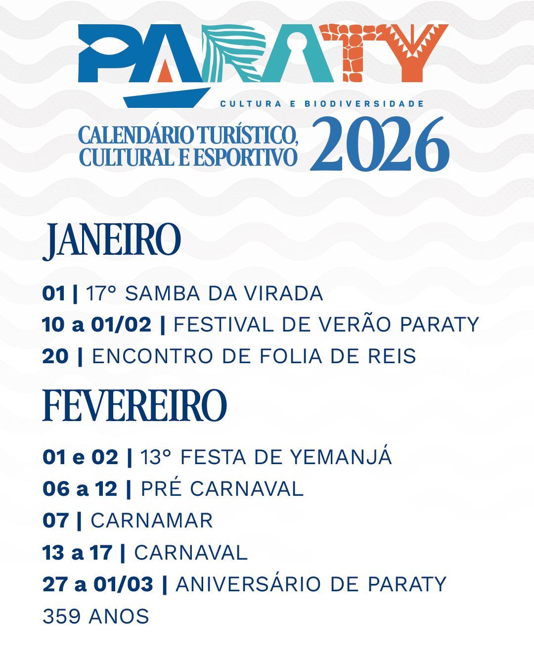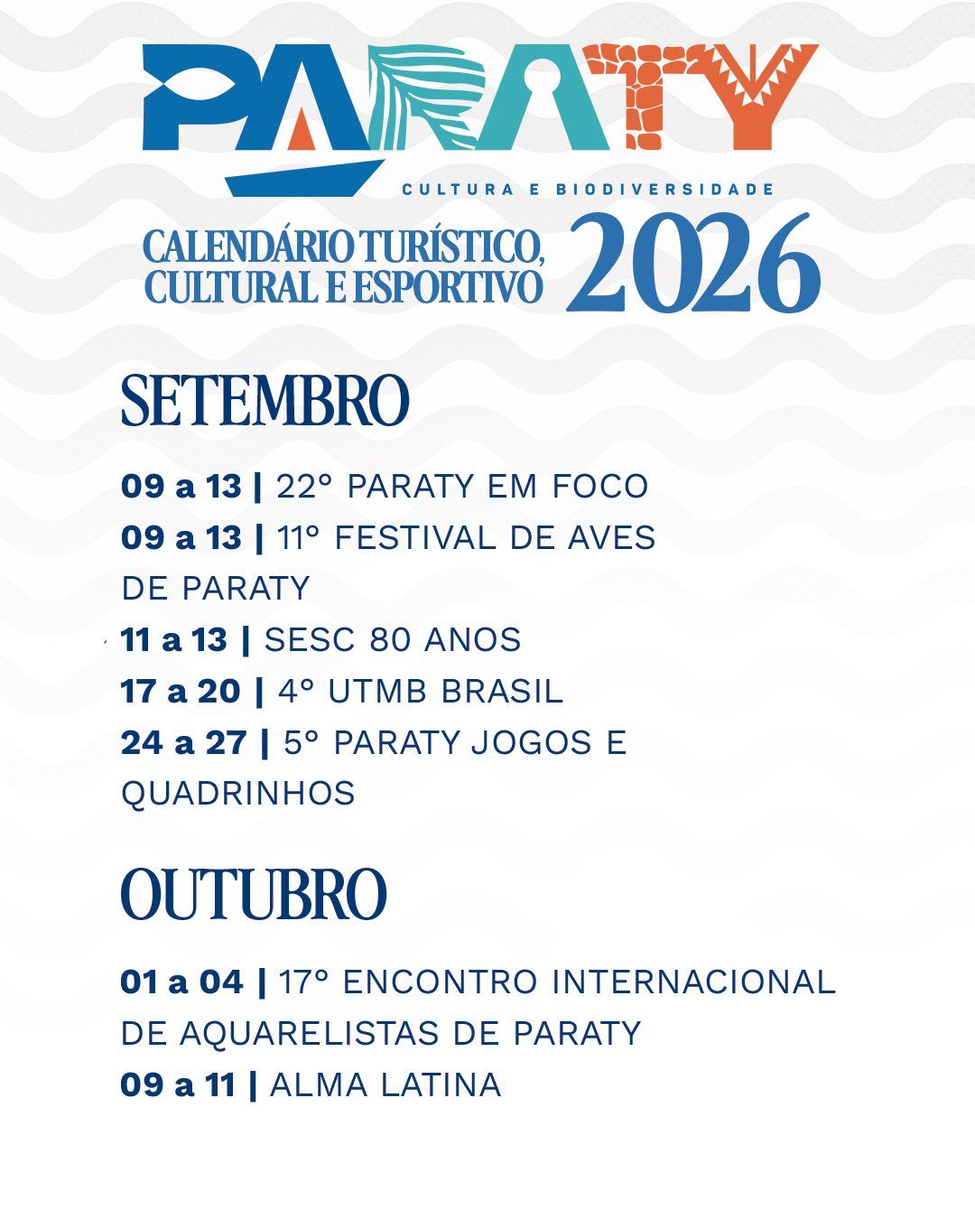 Paraty oferece um calendário turístico e cultural repleto de eventos ao longo de todo o ano de 2026, reunindo tradições populares, festivais gastronômicos, atividades esportivas, manifestações artísticas e celebrações religiosas que atraem visitantes de todas as partes do Brasil e do mundo.