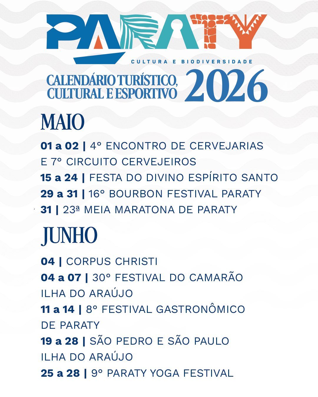Ao longo dos meses, a programação inclui festivais consagrados como o Festival Gastronômico de Paraty (valoriza a cozinha caiçara e ingredientes brasileiros), o Festival do Camarão, o Bourbon Festival de jazz e blues, além do Paraty Yoga Festival e corridas de rua.