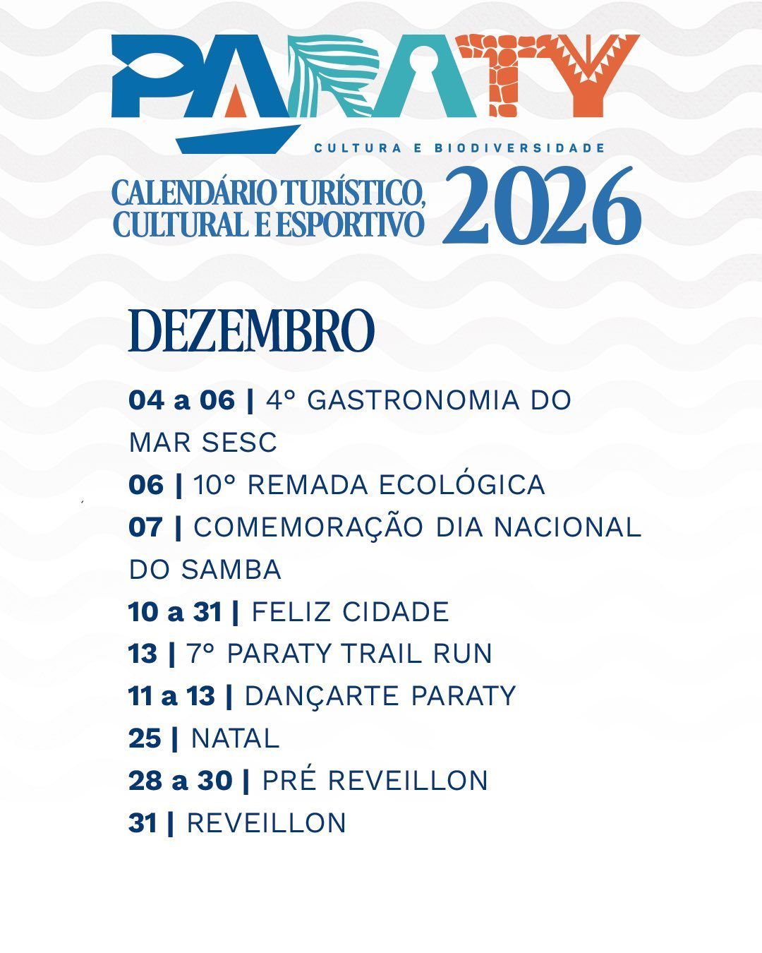 O calendário culmina com as celebrações de Natal e Réveillon, encerrando o ano com muita festa e atmosfera acolhedora, reforçando a vocação de Paraty como um destino turístico vibrante, histórico e cultural ao longo de todas as estações.