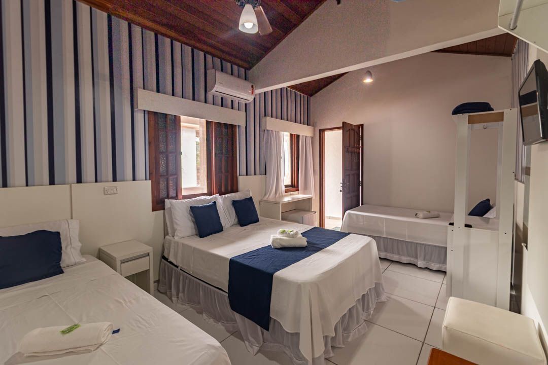Este quarto é climatizado e oferece 01 cama de casal + 02 camas de solteiro,