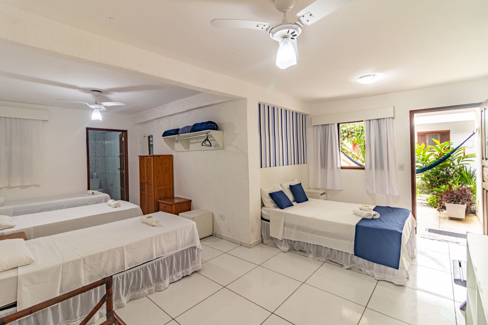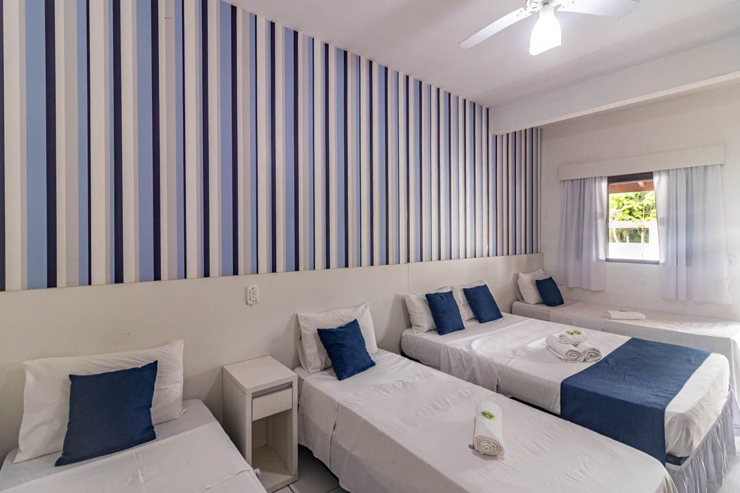 Este quarto é climatizado e oferece 1 cama de casal + 03 camas de solteiro.